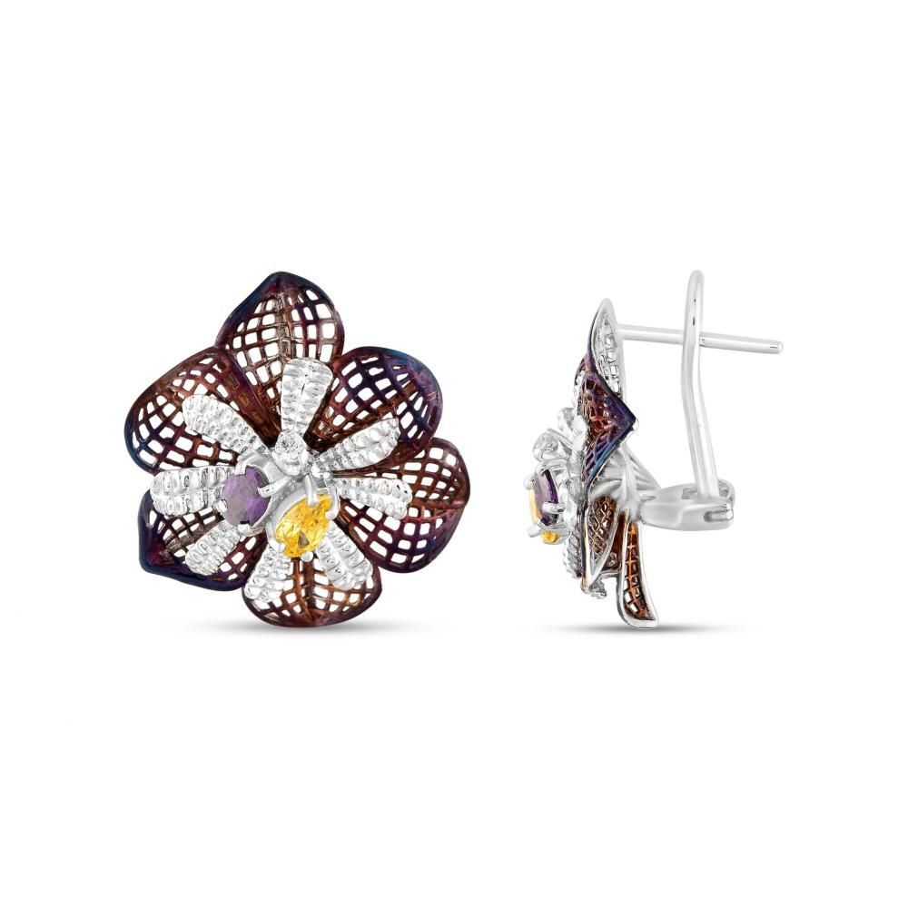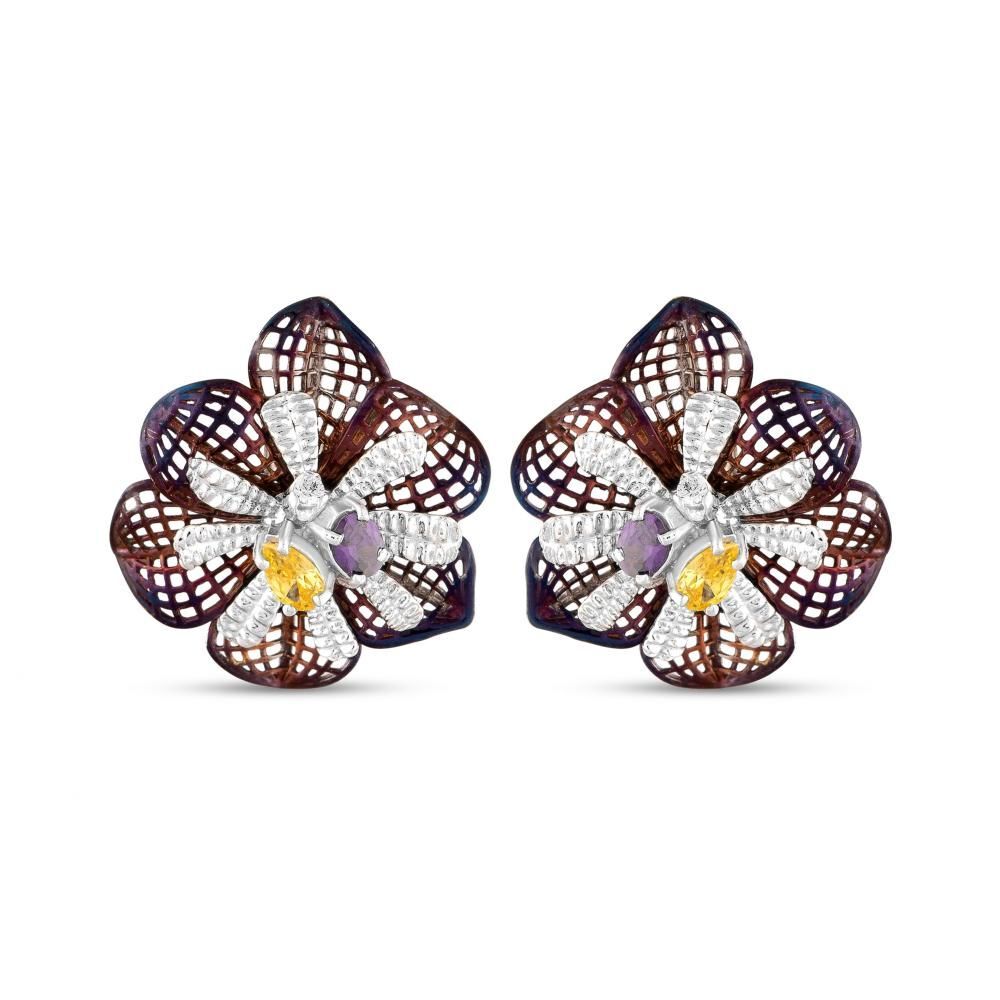 Gallica Delik Yapraklı Mor-Sarı Tohumlu Gül Model Gümüş Küpe