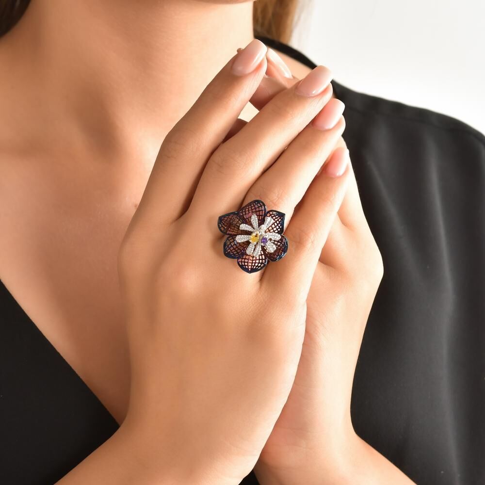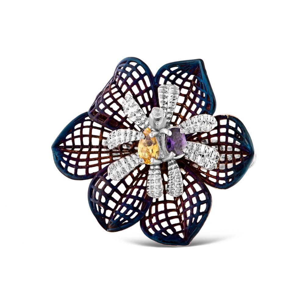 Gallica Delik Yapraklı Mor-Sarı Tohumlu Gül Model Gümüş Yüzük