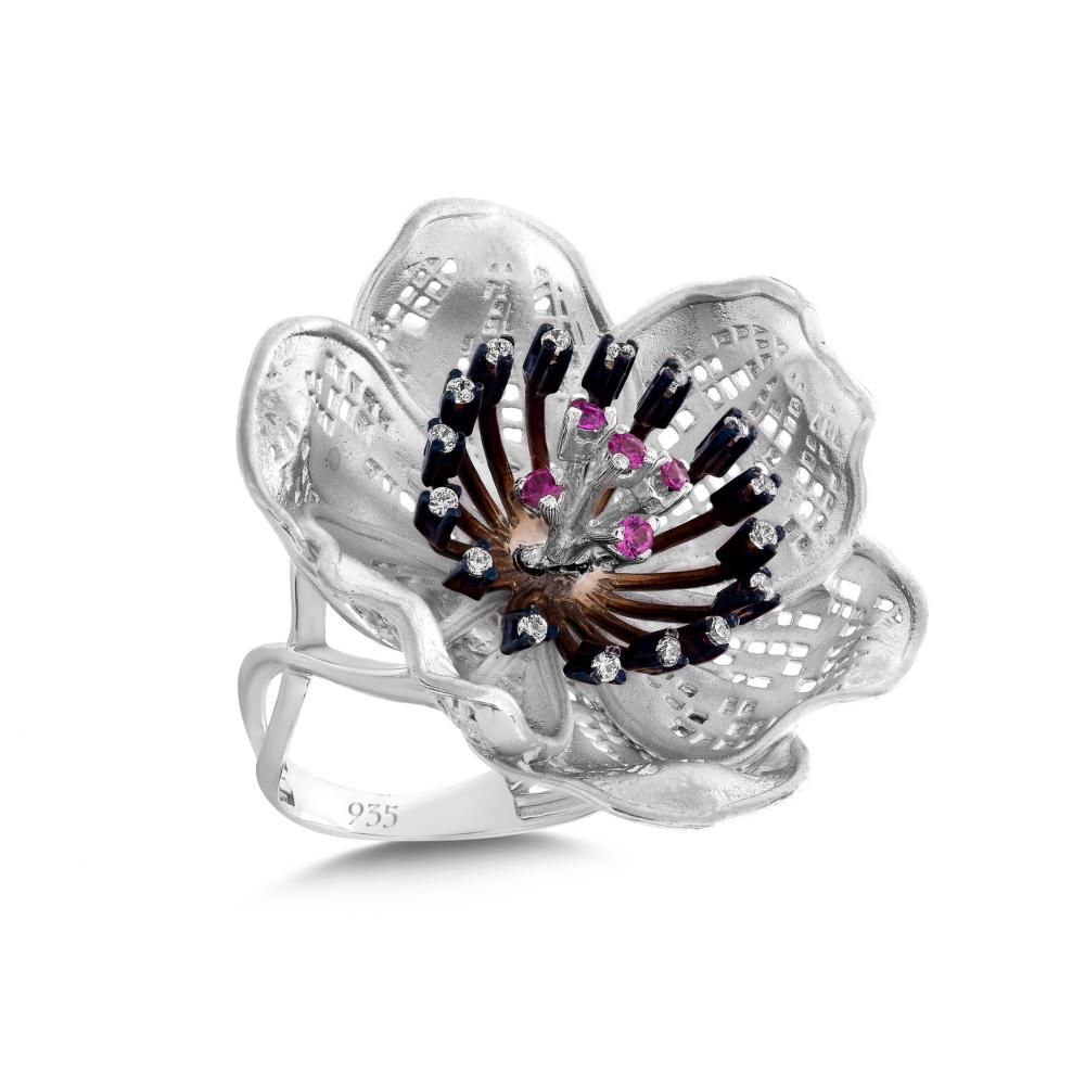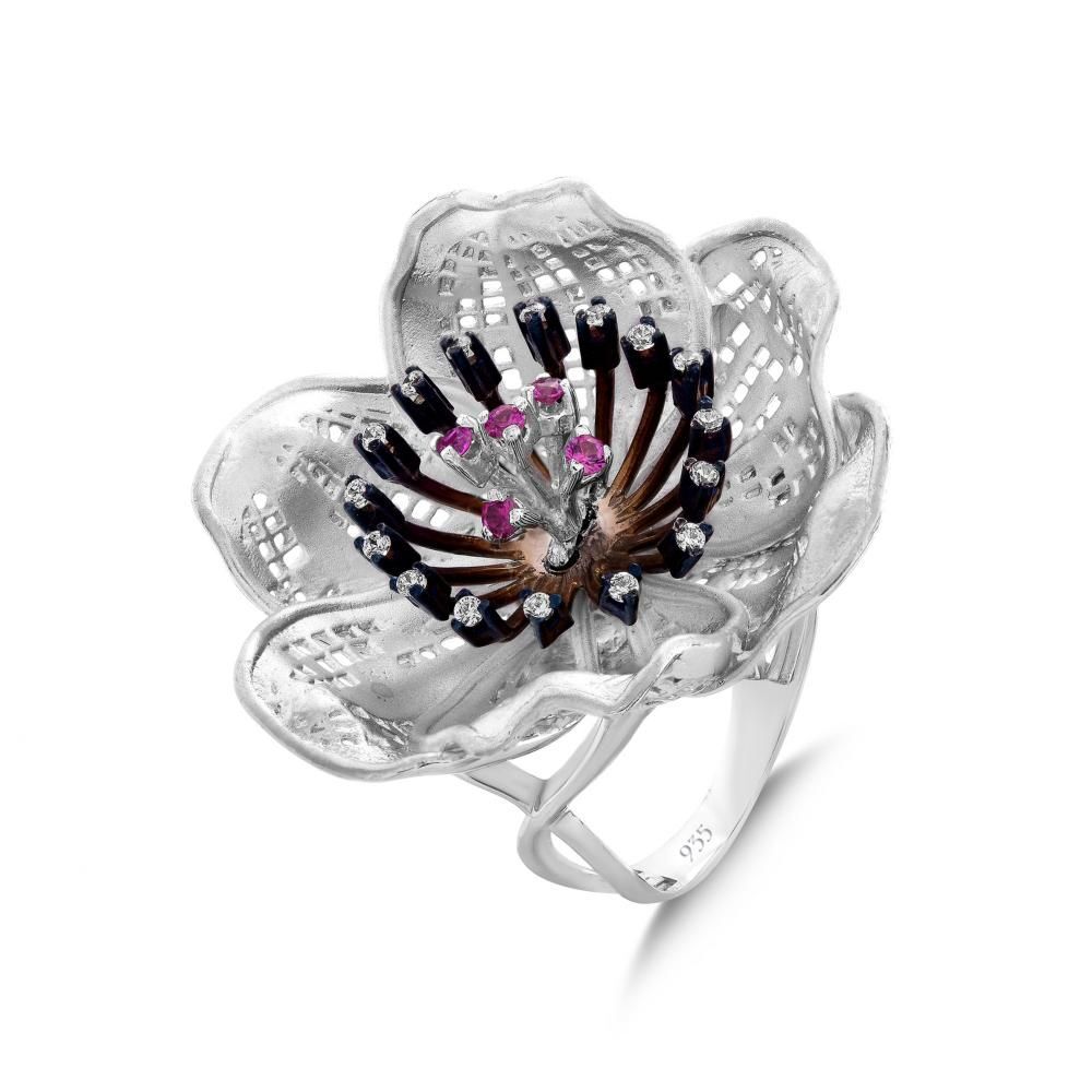 Gallica Siyah-Pembe Tohumlu Gül Model Gümüş Yüzük