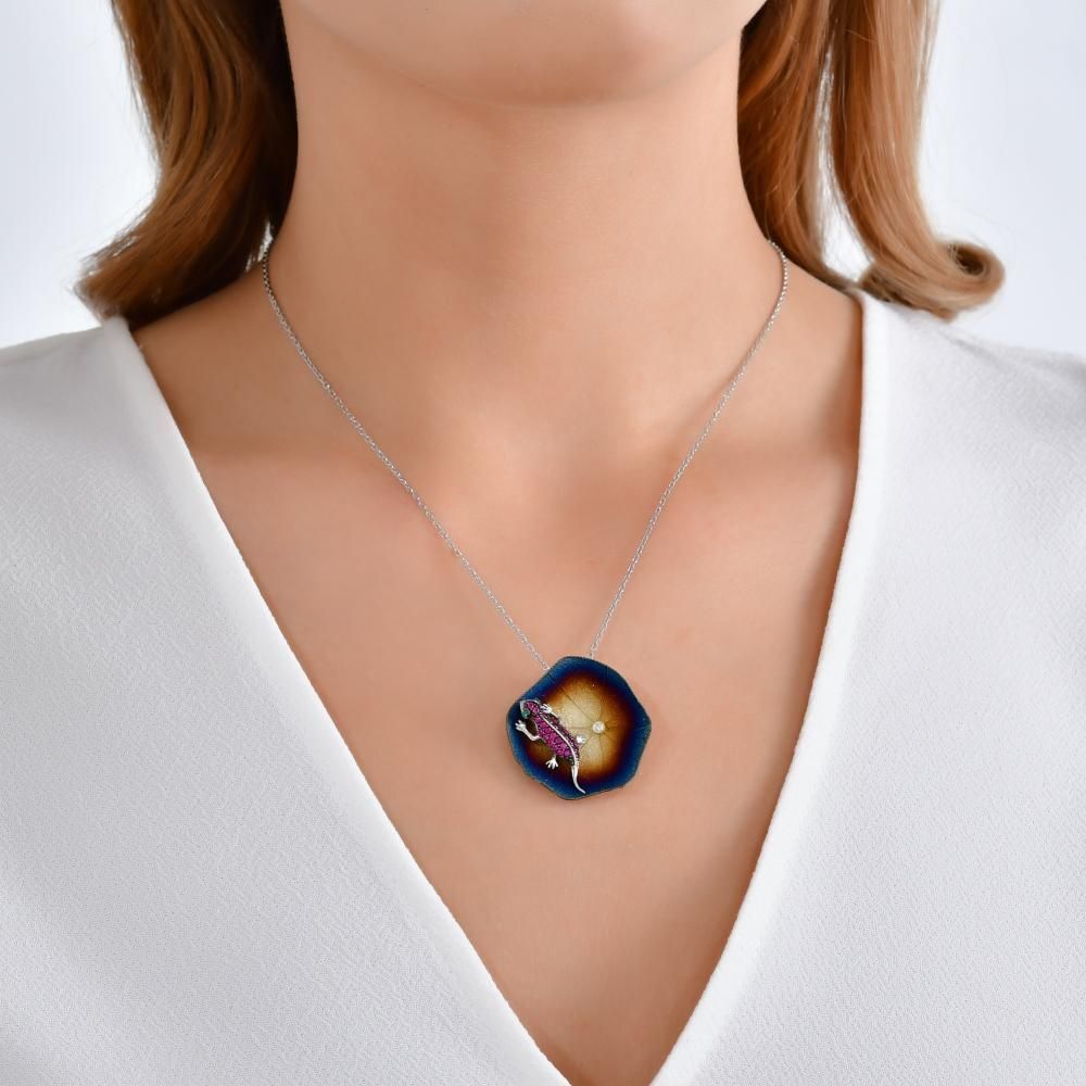 Global Warming Yaprak ve Pembe Kertenkele Tasarımlı Gümüş Kolye