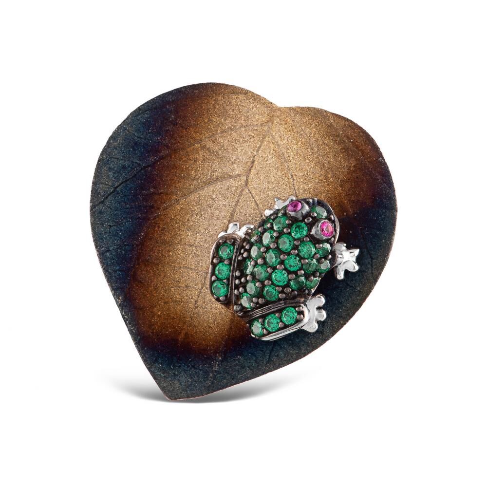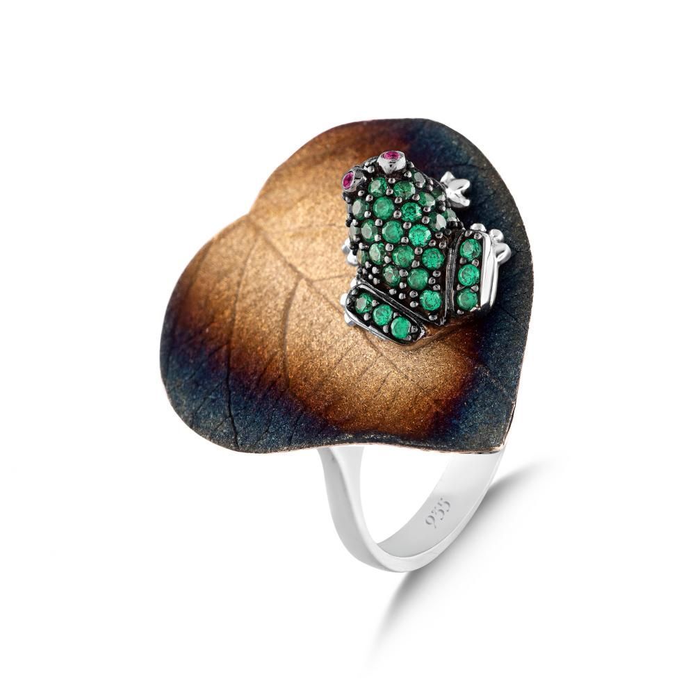 Global Warming Yaprak ve Yeşil Kurbağa Tasarımlı Gümüş Yüzük