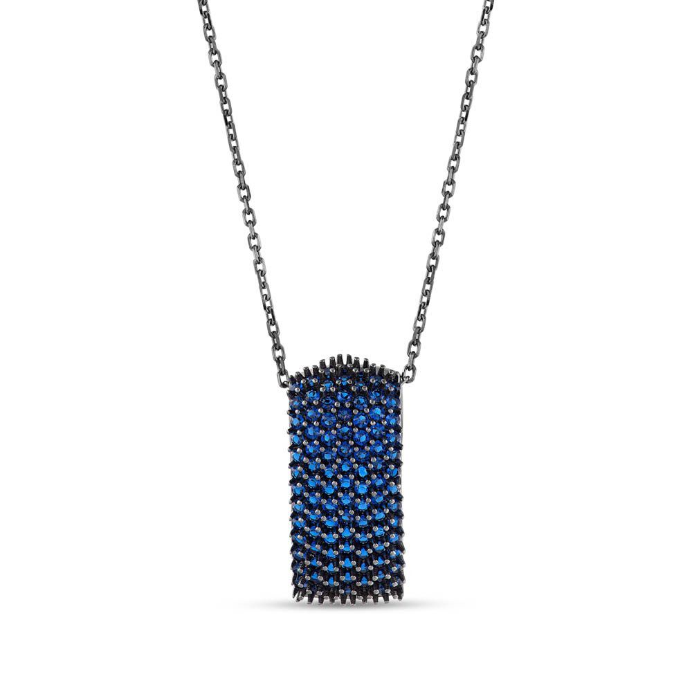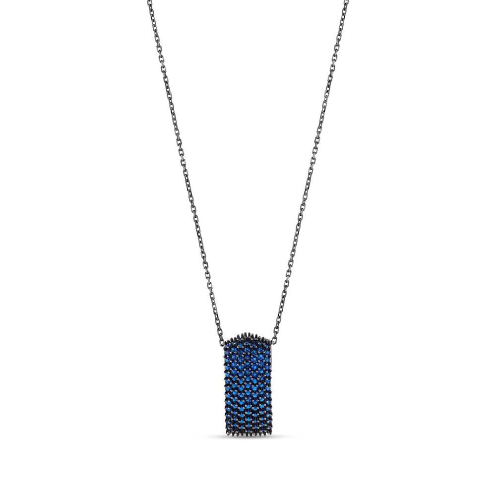 Hedgehog Mavi Bombeli Dikdörtgen Tasarımlı Rodajlı Gümüş Kolye