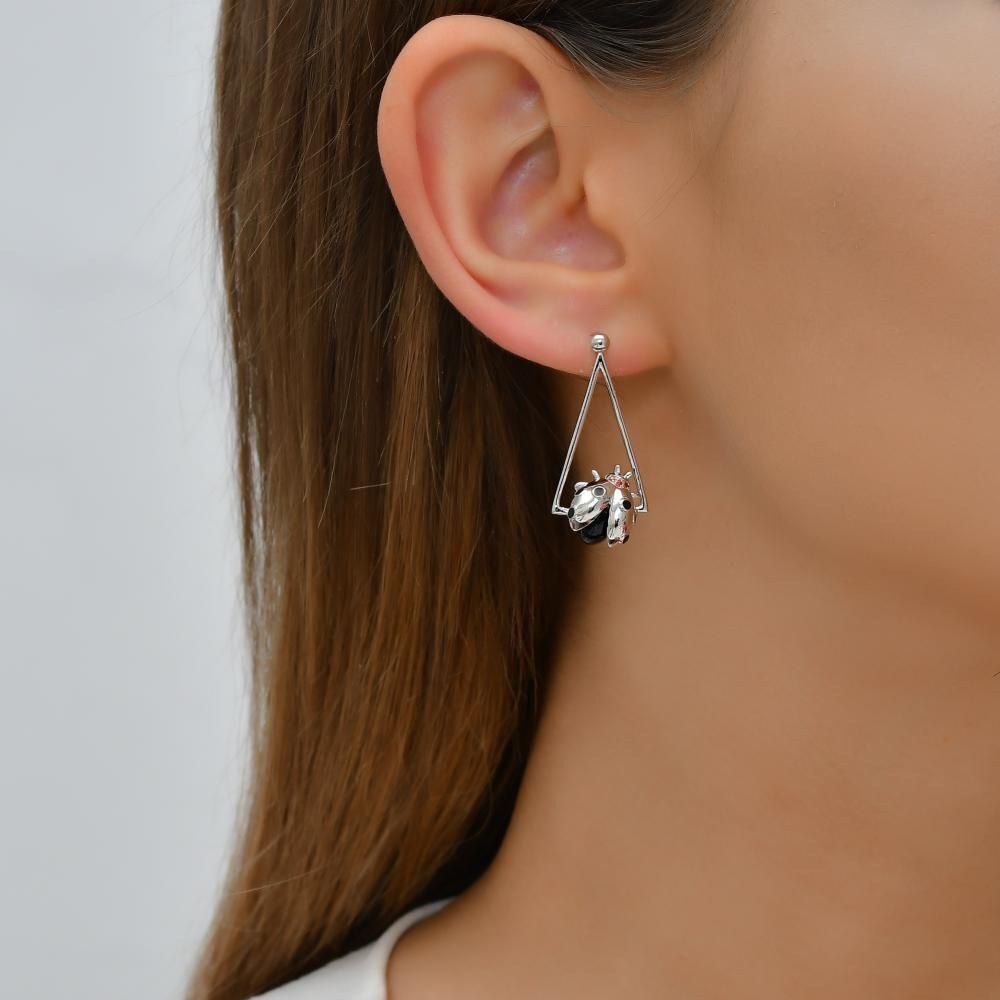 Ladybee Uğurböceği ve Üçgen Çerçeve Tasarımlı Gümüş Küpe