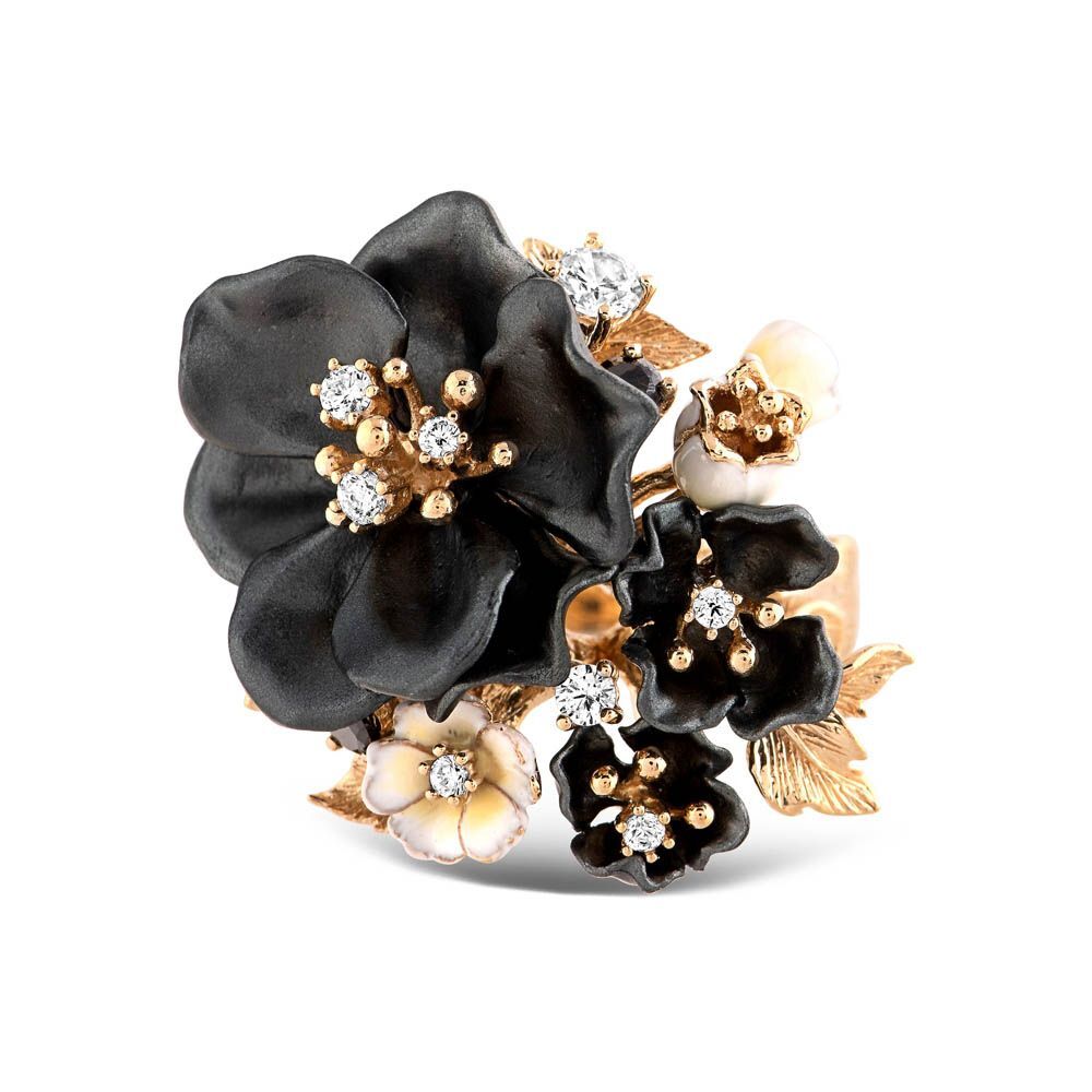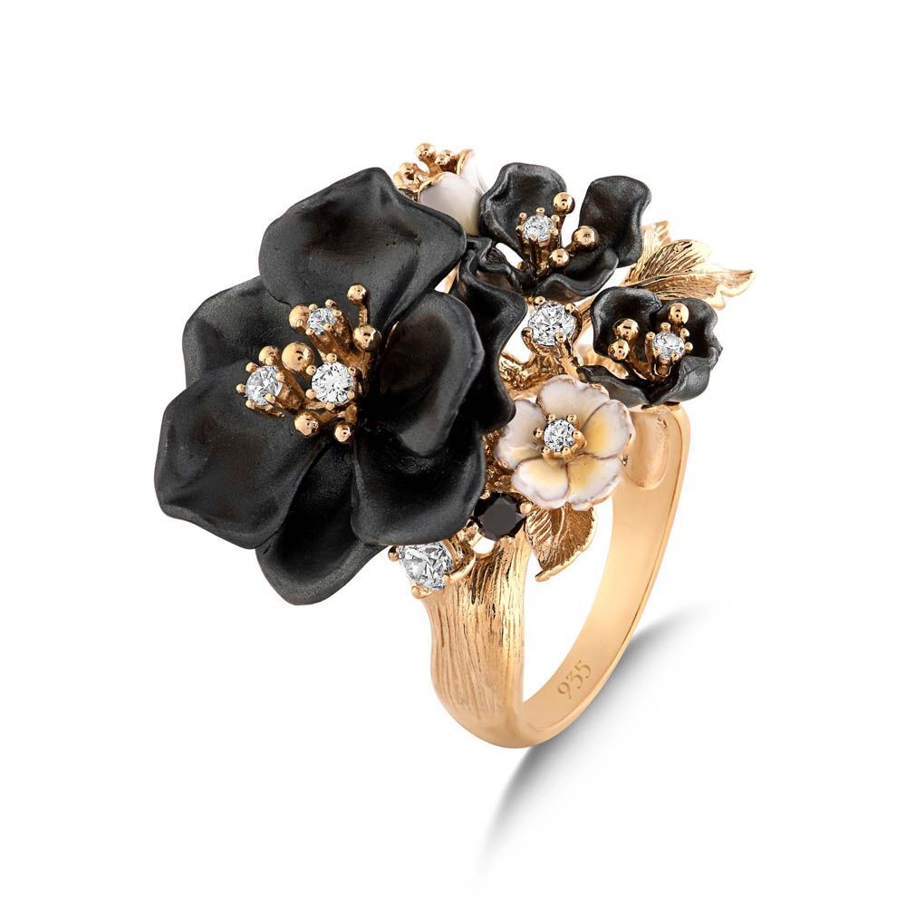 Primrose Siyah Çiçek Tasarımlı Model-2 Mineli Gümüş Yüzük