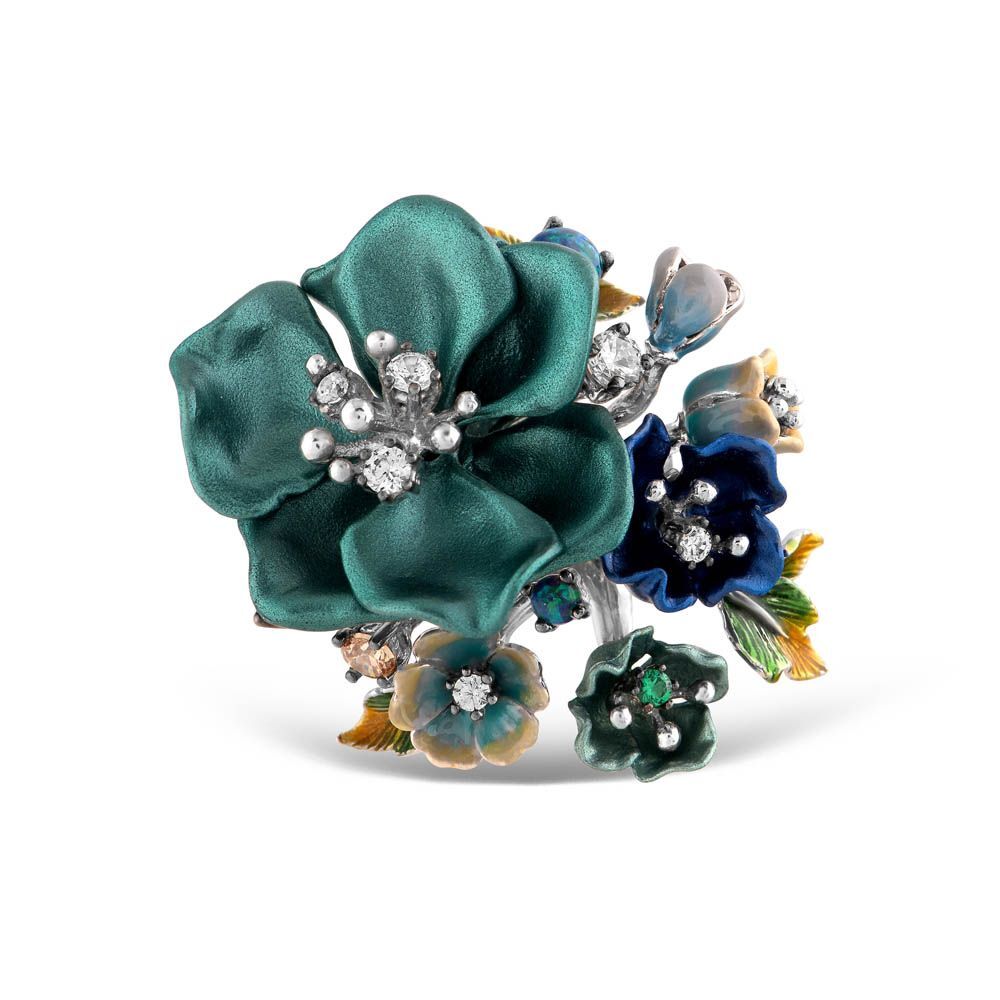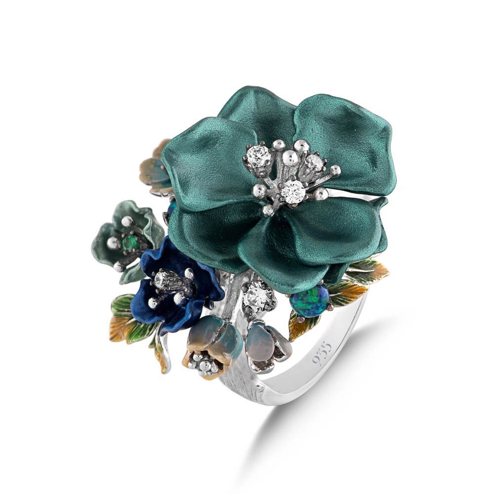 Primrose Yeşil Çiçek Tasarımlı Model-2 Mineli Gümüş Yüzük