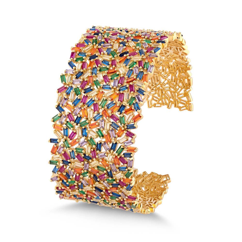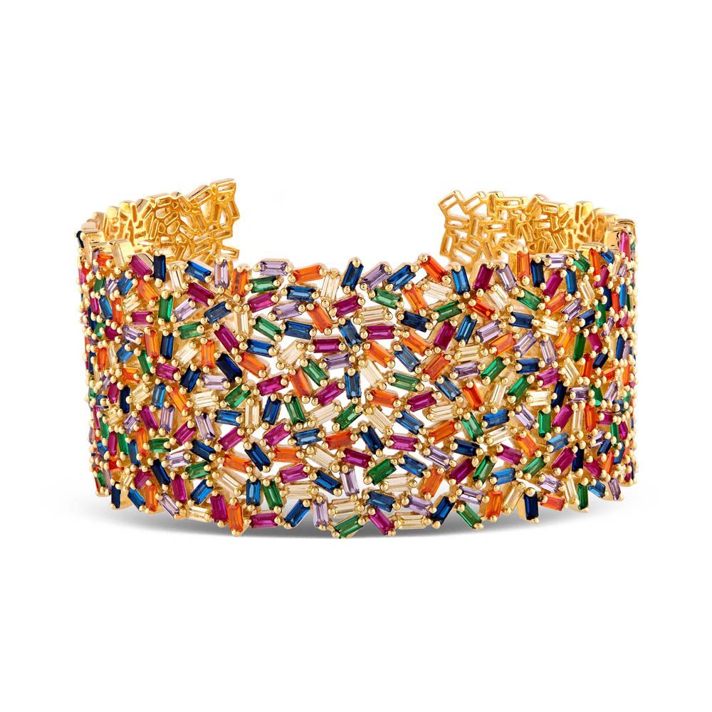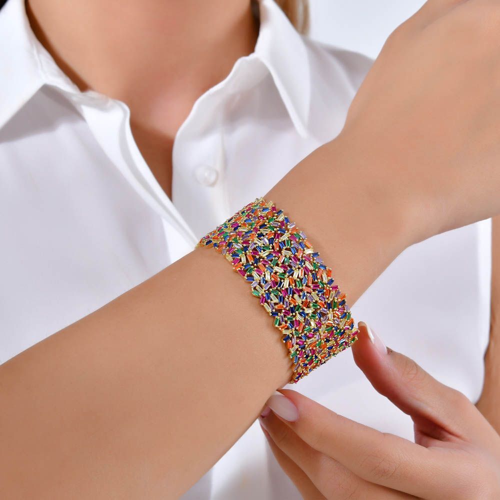 Rainbow Baget Kesim Kalın Yeşil Altın Renkli Gümüş Bileklik