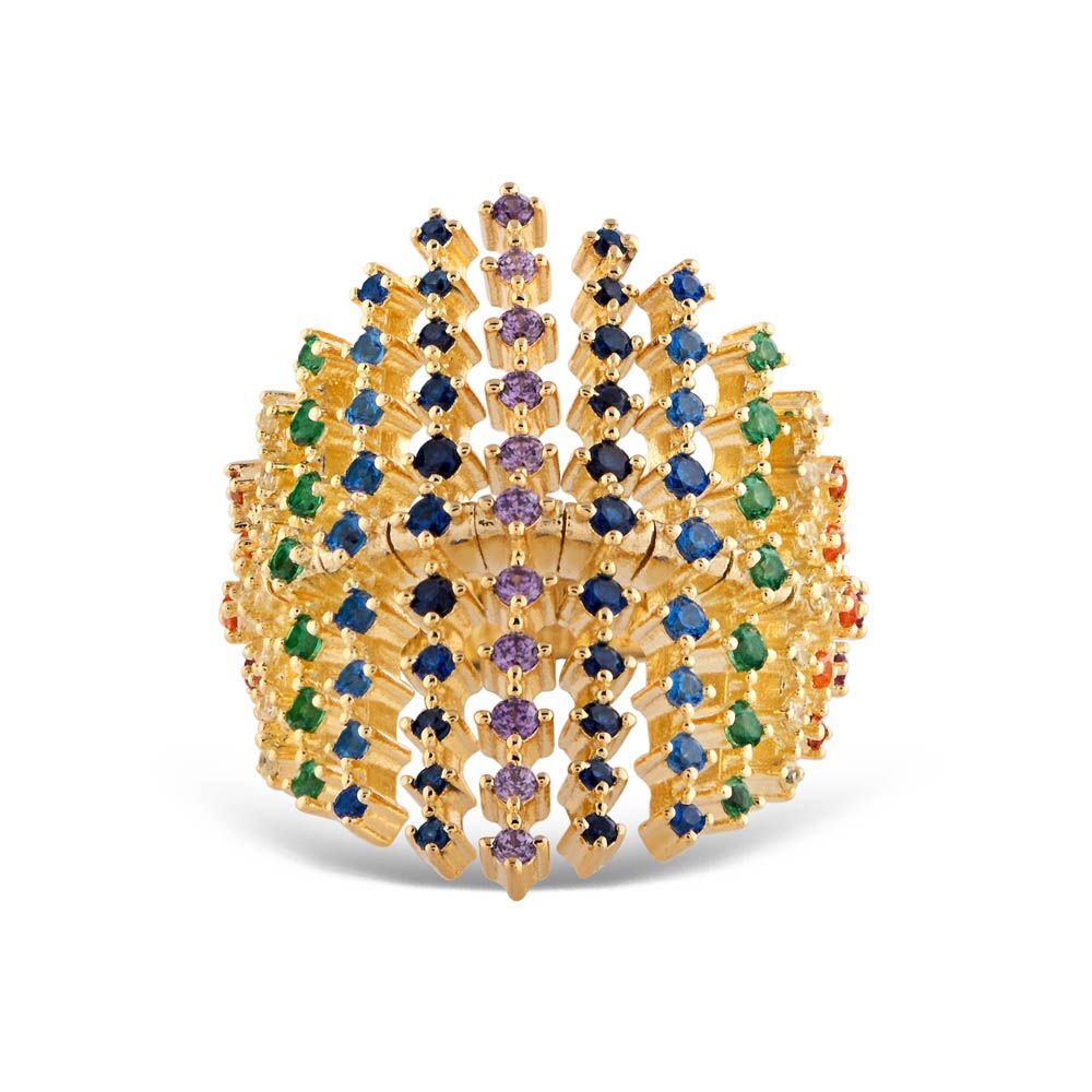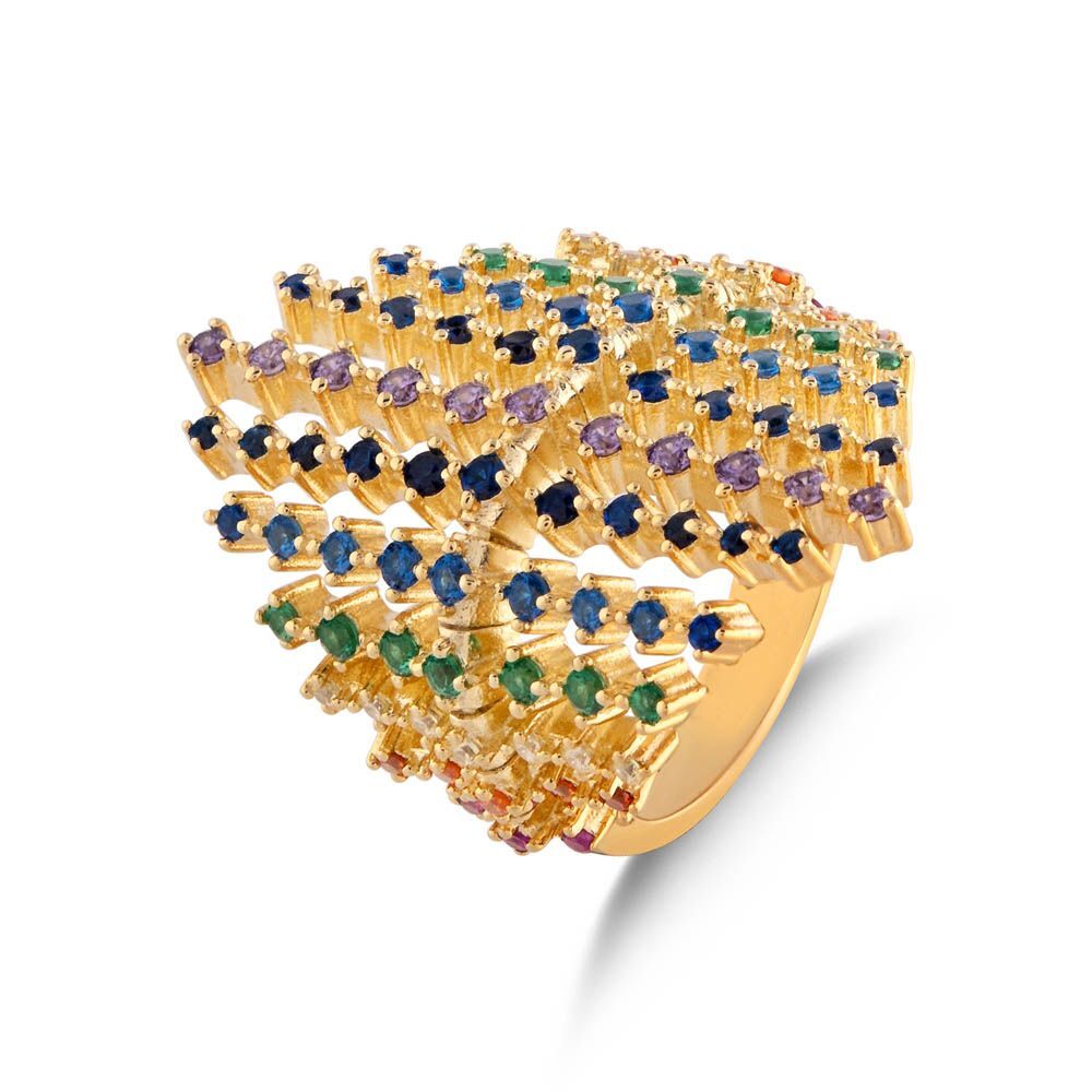 Rainbow Damla Baget Kesim Yeşil Altın Renkli Gümüş Yüzük