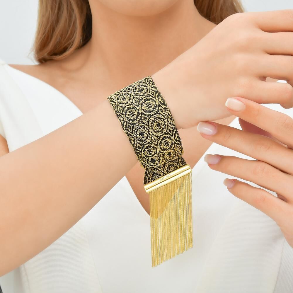 Silk Road Örgü Tasarımlı Halka Geçirmeli Altın Renkli Gümüş Bileklik